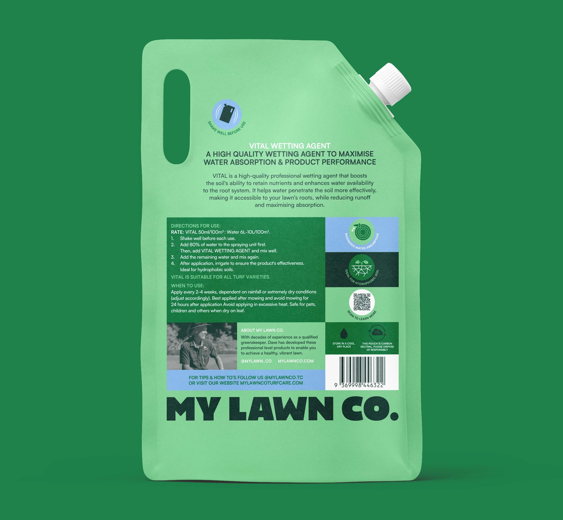 Green container of MY LAWN CO. vital wetting agent on a white background